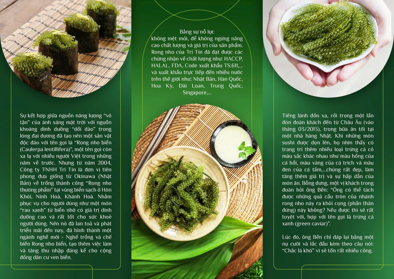 Sự kết hợp giữa nguồn năng lượng “vô tận” của ánh sáng mặt trời với nguồn khoáng dinh dưỡng “dồi dào” trong lòng đại dương đã tạo nên một sản vật độ đáo với tên gọi là “Rong nho biển (Caulerpa lentillifera)”, một tên gọi còn xa lạ với nhiều người Việt trong những năm về trước. Nhưng từ năm 2004, Công ty TNHH Trí Tín là đơn vị tiên phong đưa giống từ Okinawa (Nhật Bản) về trồng thành công “Rong nho thương phẩm” tại vùng biển sạch ở Hòn Khói, Ninh Hoà, Khánh Hoà. Nhằm phục vụ cho người dùng như một món “rau xanh” từ biển nhờ có giá trị dinh dưỡng cao và rất tốt cho sức khoẻ người dùng. Nên nó đã lan toả và phát triển mãi đến nay, đã hình thành một ngành nghề mới – Nghề trồng và chế biến Rong nho biển, tạo thêm việc làm và tăng thu nhập đáng kể cho cộng đồng dân cư ven biển.